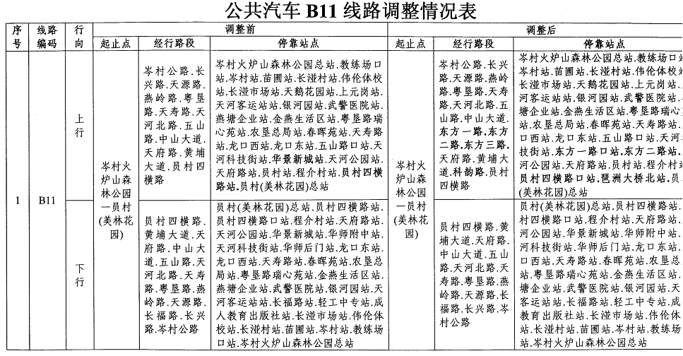 為優(yōu)先線路,方便市民出行,公司B11路線往員村(美林花園)總站方向,由原經(jīng)行中山大道、天府路、黃埔大道、員村四橫路調(diào)整為經(jīng)行中山大道、東方一路、東方二路、東方三路、天府路、黃埔大道、科韻路、員村四橫路,并相應(yīng)撤銷??繂T村四橫路站,增加??繂T村四橫路口站、琶洲大橋北站。線路起止點(diǎn)、行經(jīng)路段、??空军c(diǎn)等具體情況見附件。
