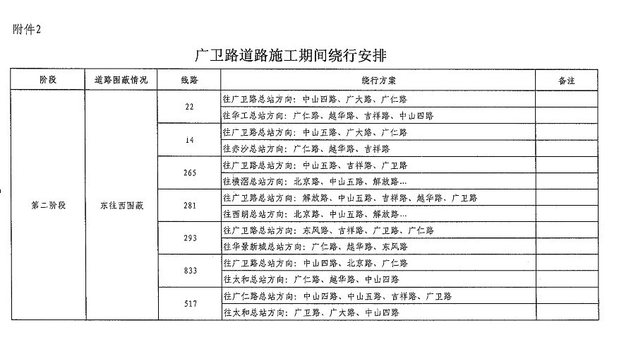 一、我公司因配合第一階段施工而調(diào)整的27路遷回原總站。第二階段施工期間,我公司原停靠廣衛(wèi)路北側(cè)公交總站的14路、22路臨時(shí)遷移至廣仁路(見(jiàn)附件1)。施工期間各線(xiàn)繞行情況見(jiàn)附件2。