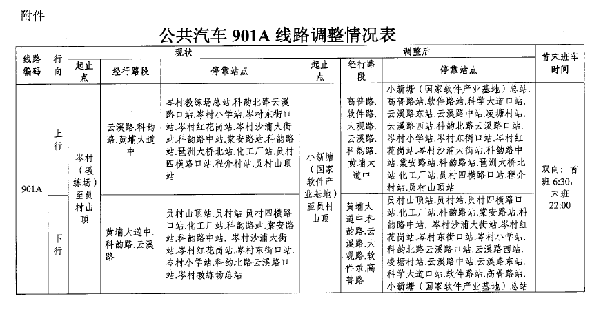 一、我公司901A路線由岑村至員村山頂調(diào)整為小新塘(國家軟件產(chǎn)業(yè)基地)至員村山頂,具體線路起止點、經(jīng)行路段、??空军c及營運服務(wù)計劃等調(diào)整情況見附件。