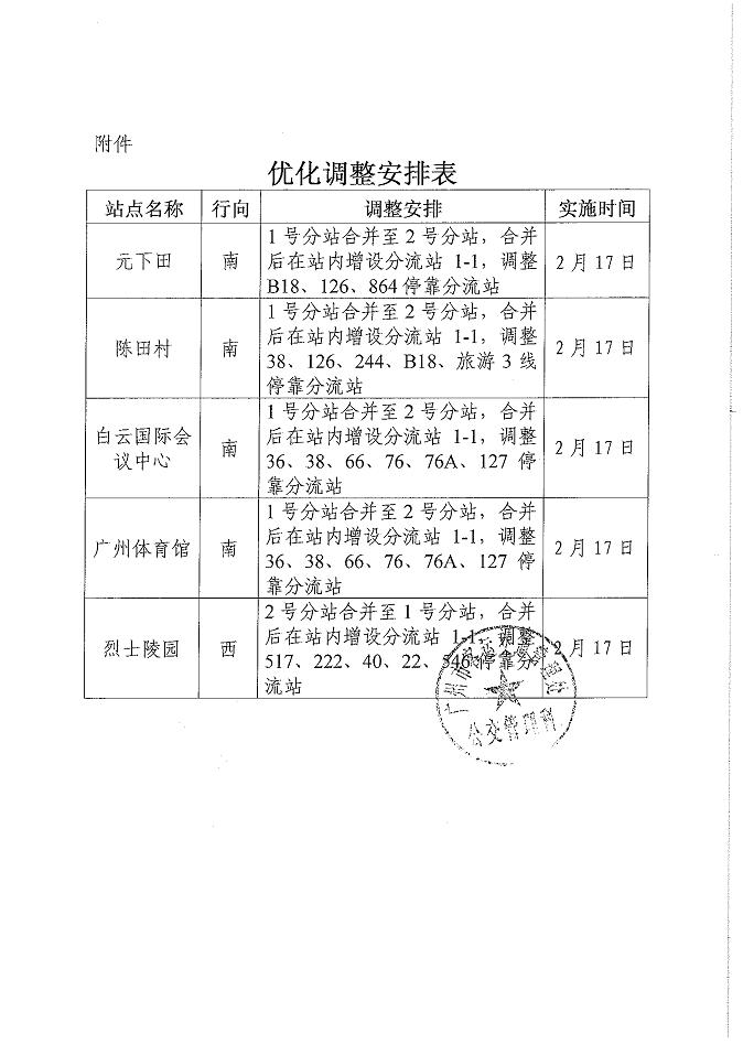 一、撤銷元下田站(南行)1號分站、陳田村站(南行)1號分站、白云國際會議中心(南行)1號分站、廣州體育館站(南行)1號分站、烈士陵園站(西行)2號分站,具體安排詳見附件。