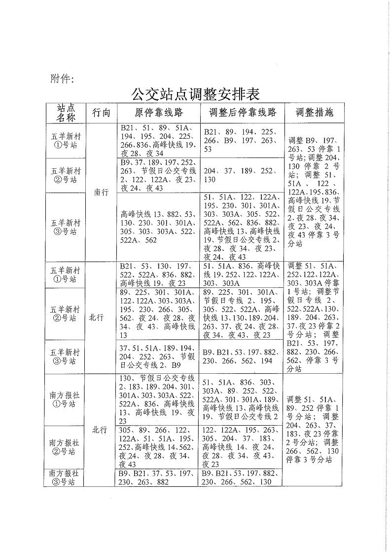 一、南方報社(北行)、五羊新村(雙向)等站的??烤€路實施分站間優(yōu)化調(diào)整,具體調(diào)整情況詳見附件。