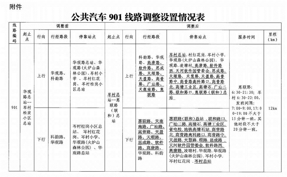 經(jīng)廣州市交通委員會批準(zhǔn),同意我司901路線由岑村松崗小區(qū)至華觀路調(diào)整為岑村至惠聯(lián)路(聯(lián)和),調(diào)整后線路具體行經(jīng)路段、??空军c(diǎn)等詳見附件。